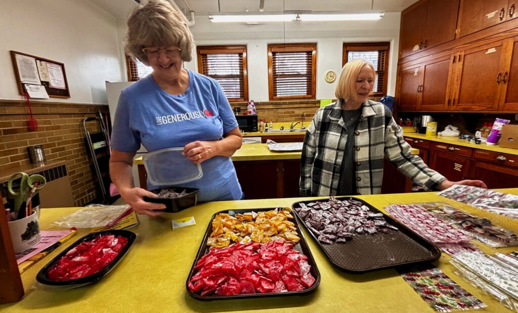 Karen Brueggemeier and Pat Timmons prepare some of the hard tack candy for sale at the Cookie Walk event.