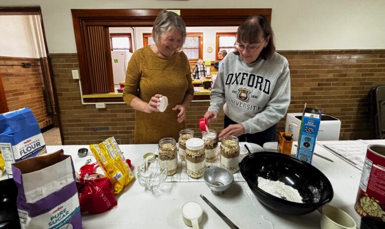Patti Snyder and Mary Ann Bockbrader fill mason jars with dry ingredients for the cookie jar gifts.