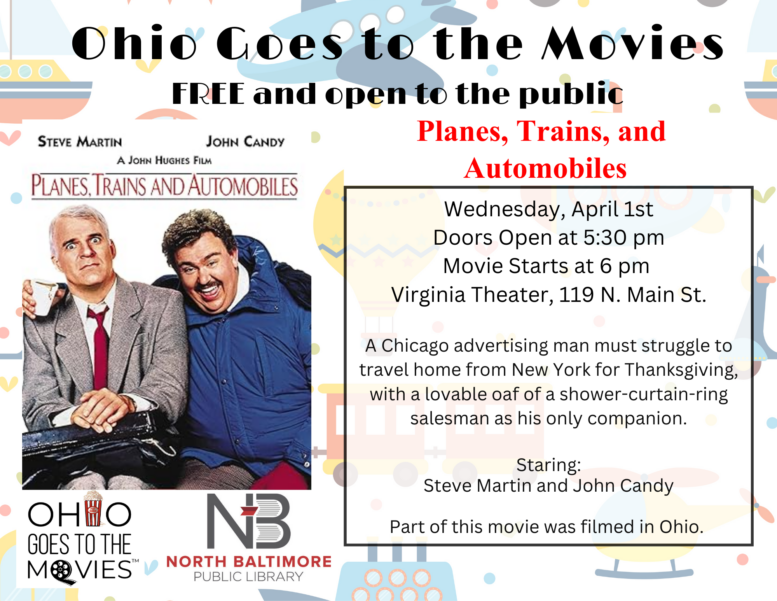 The North Baltimore Public Library has chosen to show “Planes, Trains, and Automobiles,” starring Steve Martin and John Candy. A portion of this movie was filmed in Ohio.
