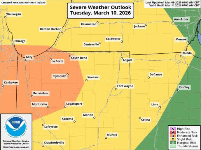 Wood County is currently under a “slight risk,” 2 of 5, for severe weather on Tuesday, March 10, into early Wednesday, March 11, morning. Multiple waves of storms will move through Wood County starting around noon on Tuesday, continuing through Wednesday morning.