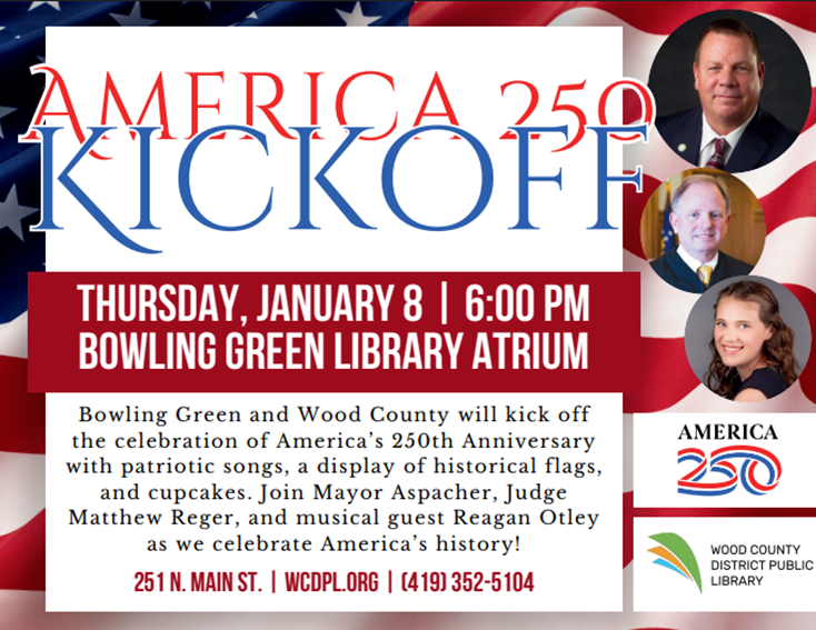 Everyone is invited to join the Wood County District Public Library to kick off “America 250,” a series of events celebrating the United States of America’s 250th birthday. The first event will take place in the Bowling Green library atrium on Thursday, Jan. 8, at 6 p.m.