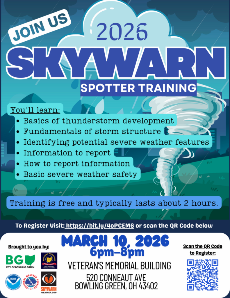 The Wood County Emergency Management Agency invites the community to participate in SKYWARN spotter training. The training will take place on Tuesday, March 10, from 6 – 8 p.m., at the Veterans’ Memorial Building in City Park, 520 Conneaut Ave., Bowling Green.