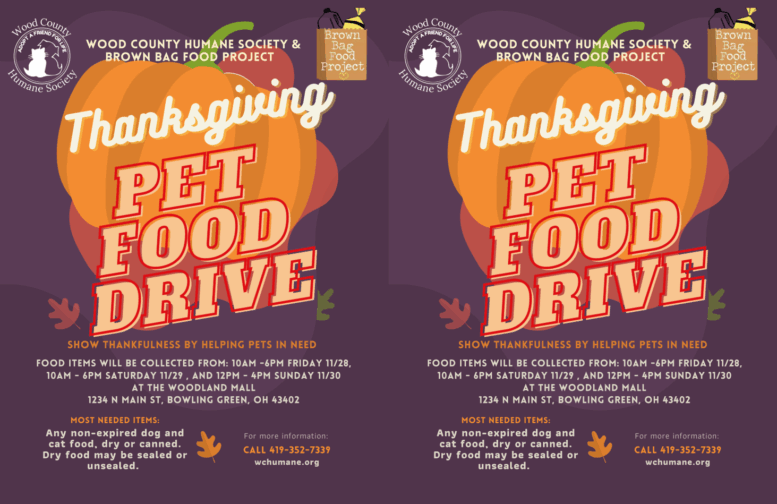 Wood County Humane Society will be collecting donations of pet food for Brown Bag Food Project. Donors’ generosity will provide much-needed relief to families in the community.