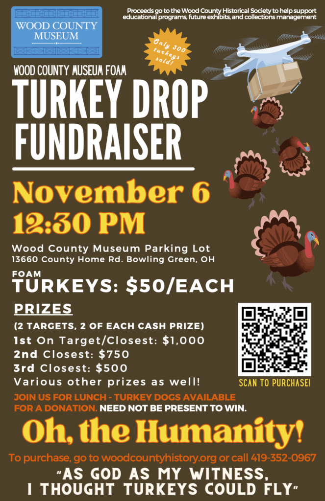 The Wood County Museum invites the community to participate in its foam turkey drop fundraiser on Thursday, Nov. 6, at 12:30 p.m., in the Wood County Museum Parking Lot, 13660 County Home Road, Bowling Green. To participate, people can purchase a foam turkey for $50 each; only 300 turkeys will be sold.