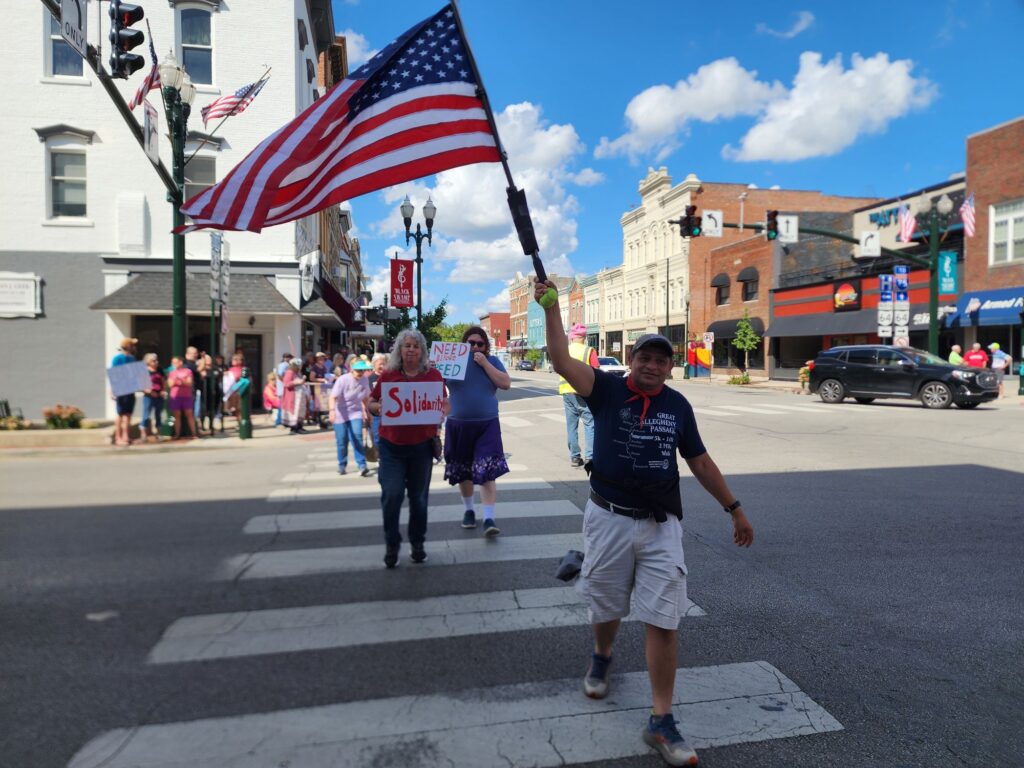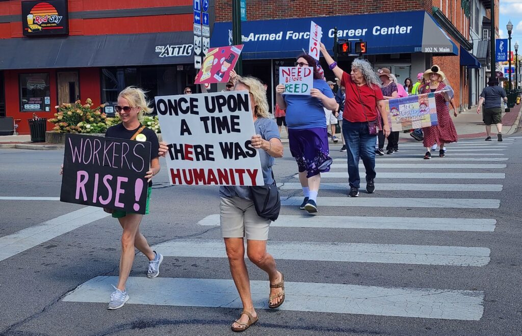 The newly-formed gaggle of grannies included Buffi Elwazani, Kendel Kissinger and Laura Burdine-Schutze. They protested the Trump administration’s attacks on democracy, health care, public television, and its illegal stance on immigration. As they marched, they sang a version of “When the Saints Go Marching In,” with lyrics asking where Congressman Bob Latta has been.