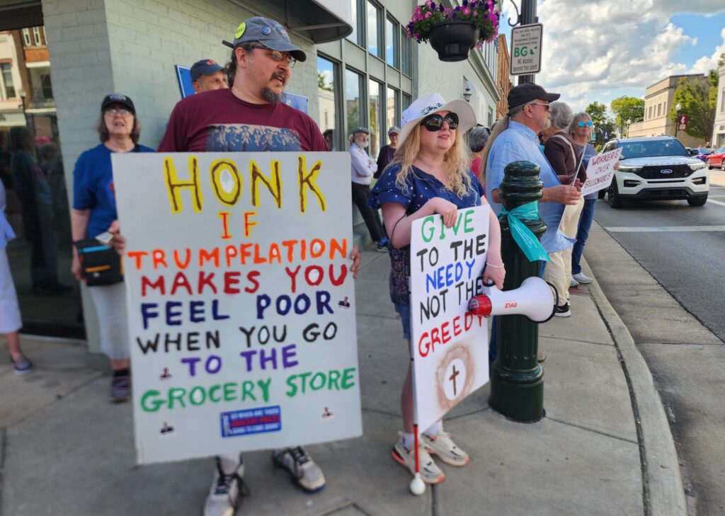 Nearby, William Cohara, of McClure, held a sign stating, “Honk if Trumpflation makes you feel poor when you go to the grocery store.”