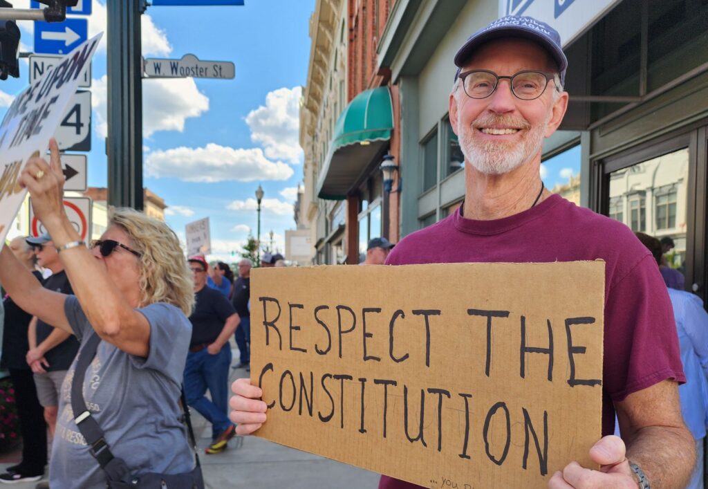 Steve Heckler, of Haskins, holds sign at protest.