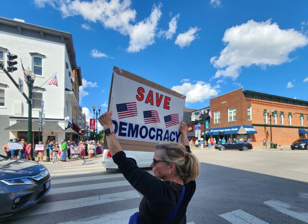 Standing at the four corners of Main and Wooster streets, Jean Lahey, of Perrysburg, held her “Save Democracy” sign over her head as cars passed by.