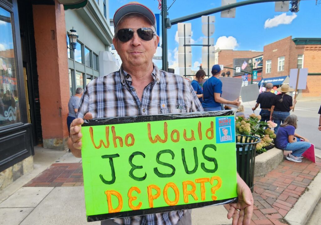 A little further down Main Street, Steve Heckler, of Haskins, held a sign asking, “Who Would Jesus Deport?”